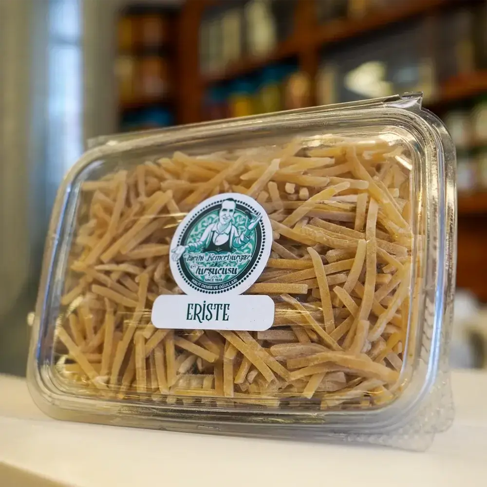 Erişte, Anadolu mutfağının geleneksel hamur işi lezzetlerinden biri olarak, ince şeritler halinde kesilip kurutulan özel bir makarna çeşididir. Tarihi Kemerburgaz Turşucusu tarafından geleneksel üretim anlayışıyla hazırlanan bu erişte; pratik pişirme süresi, doyurucu yapısı ve tariflere kolay uyum sağlayan dokusuyla hem günlük sofralarda hem de özel yemeklerde kendine yer bulur. Tanıdık ev lezzetini sofralara taşıyan sade ve dengeli bir üründür.